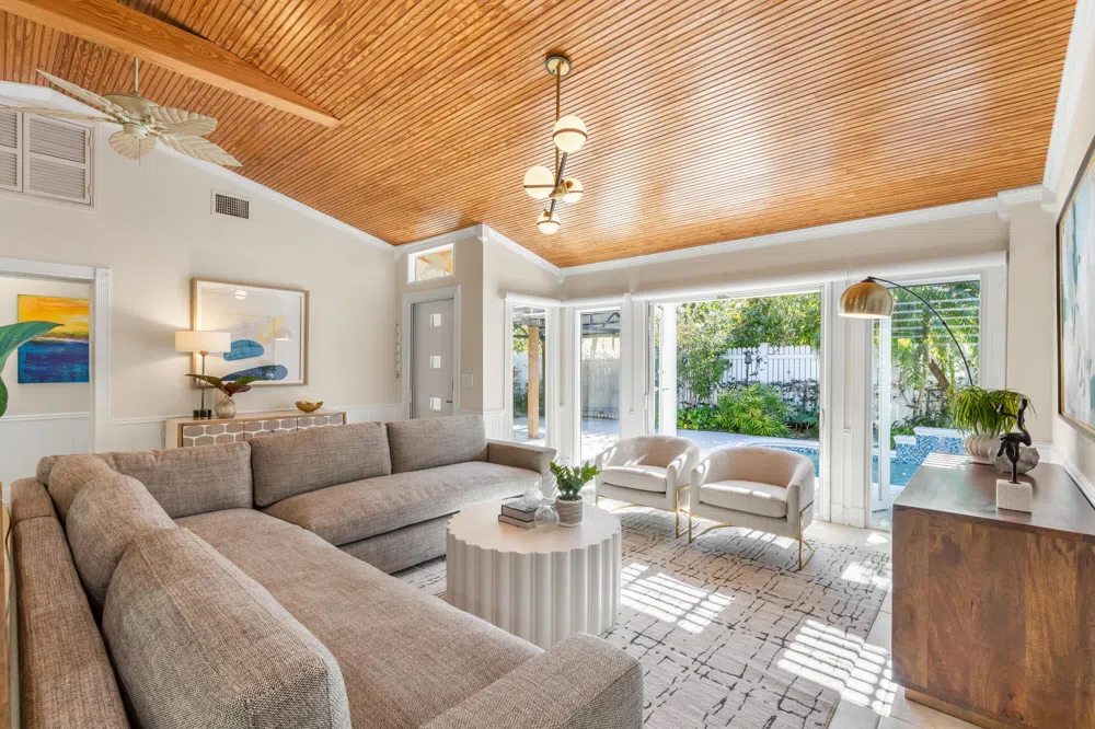Don't miss your chance to own this exceptional Key West residence that effortlessly combinesLuxury, functionality, and a prime location.This exquisite 3 bedroom, 3-bathroom house is nestled on a fully fenced corner lot.This home boasts an expansive, open-concept living space with bone tile flooring throughout.The split bedrooms are cleverly separated by a massive living/dining area with cathedral ceilings.Enjoy seamless indoor/outdoor living with French doors leading from the master bedroom, guest bedroom, living, and dining areas to the enchanting exterior spaces. The U-shaped granite countertop kitchen with stainless steel appliances is perfect for culinary exploration and entertaining guests. The oversized primary suite is adorned with Hunter-Douglas remote blackout shades and features a stunning en suite bathroom that offers the perfect escape.The shared bathroom is uniquely designed with a telescope skylight. The third bathroom features a bath tub and is located within the laundry area. Step outside to a concrete wrap-around patio with a shaded outdoor dining area and cool off in the heated/chilled pool which includes a soothing water feature. The property is equipped with a whole house generator, remote hurricane shutters, and On Demand hot water. Additional conveniences include 3 exterior storages sheds, one housing a full-sized freezer, another with 2 small beverage refrigerators. Dedicated off-street parking provides space for 2 cars, with 3 separate entrances to this private property.