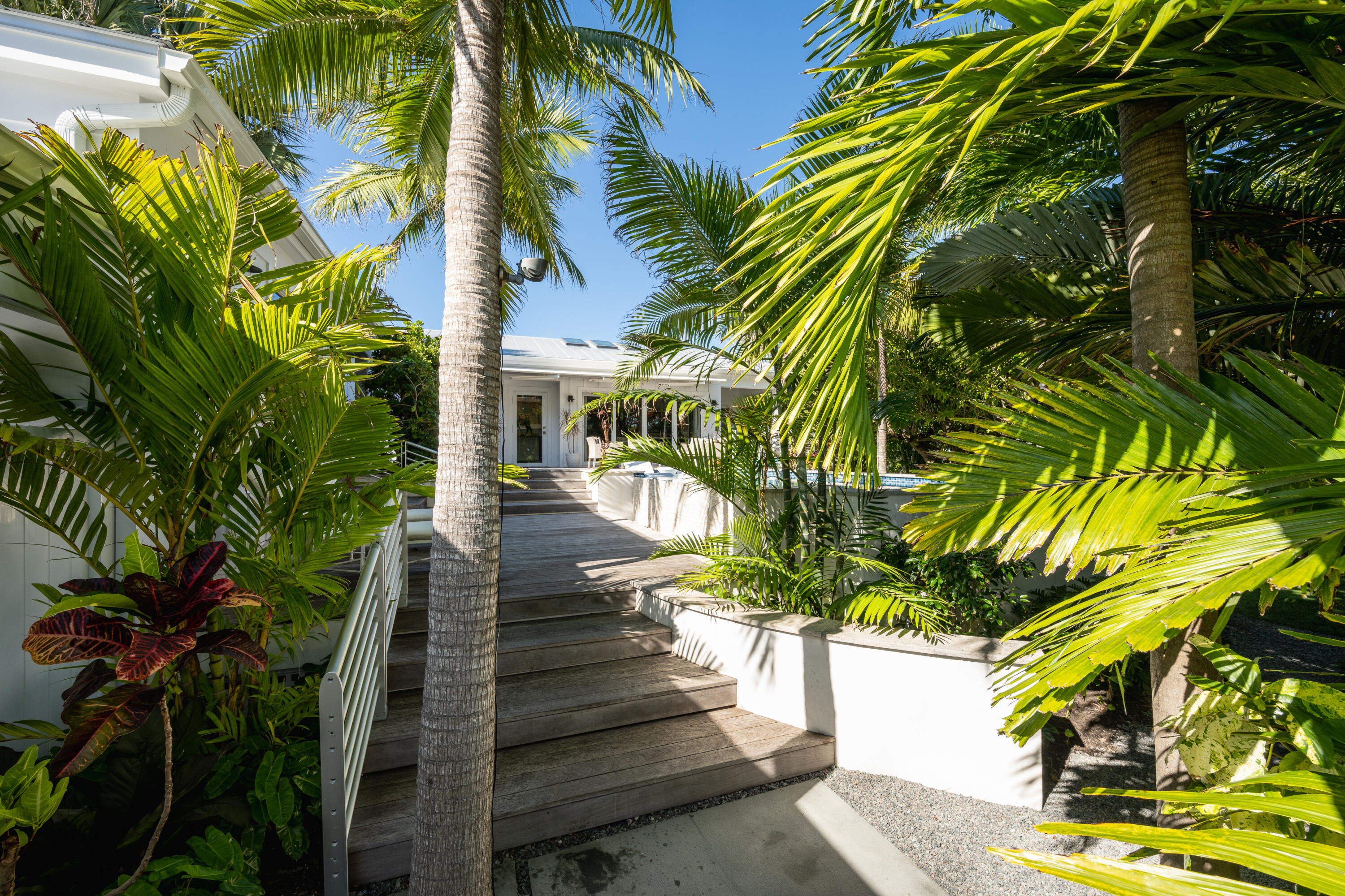This impeccably designed home was constructed in 2019 and is sited on a desirable corner lot, walled for privacy, creating a beautiful Midtown oasis. Upon entering through the front gate, you immediately get a sense of how special this property is with its stunning landscaped garden and architectural elevated pool and Ipe decked surround perfect for outdoor entertaining. The residence is comprised of a two bedroom, two and a half bath main house and a guest cottage with a full bath. The main house has a semiformal entry leading to an impressive great room with walls of glass and a dramatic vaulted ceiling with skylights providing a light-filled room with captivating views of the outdoors. This open concept design features large living and dining areas with an adjacent fully equipped kitchen with sleek cabinets, high end appliances and a butler's pantry. The primary bedroom retreat consists of a spacious bedroom with a walk-in closet and a sexy bath finished in a dark gray palette with large tiled shower and a vaulted ceiling. There is a nice guest bedroom at the rear of the home with an ensuite bath. The guest house is equally as stunning as the main house with walls of glass and well-appointed bath. In addition, there is covered parking for two cars, a rarity in Key West. This exceptional property is beautifully designed with a special attention to details and finishes that must be seen to be fully appreciated.