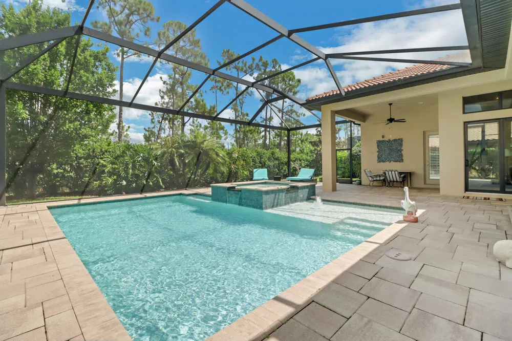 Experience luxury living in this elegant 3,344 square foot pool & spa home in sought after Bonita Lakes, a premier gated community in Bonita Springs, FL. This breathtaking residence offers gorgeous tray designed high volume ceilings, neutral tile flooring, carpeted bedrooms, and plantation shutters throughout. The almost 2,100 square foot screened lanai provides expansive outdoor entertaining area by the salt water heated pool and spa with dual waterfalls. It also features formal dining and living rooms, a family room, and an eat in kitchen plus a bonus office/den. The split floor plan adds additional privacy while the overall layout flows nicely, and being all ground level is very convenient, no stairs!!! The guest bedrooms are all spacious with walk in closets, and the master side of the house includes two huge walk in closets located in the master hallway, and a large master bath with a soaking tub, separate shower, and dual vanities. The gourmet kitchen includes stainless appliances, gas cooktop, wall oven, an oversized farm sink, granite counters, custom cabinets with the soft close feature and pull out drawers, as well as a small pantry. Superior quality construction by Toll Brothers includes impact windows and doors. Amenities include a large clubhouse with an entertainment area, gym, pool, spa, splash pad, tennis courts and bocci courts. This property is conveniently located minutes from I75, and only 11 miles from the SW Florida International Airport. Near pristine Gulf beaches, a multitude of championship style golf courses, lots of cultural and recreational attractions, as well as shopping and dining at Coconut Point Mall, the Gulf Coast Town Center, and the Miromar Outlets. There is no shortage of things to do nearby. Association Fee of $3100 is a one time fee with application. Quarterly Maintenance Fee of $1625 includes landscape maintenance of each house.