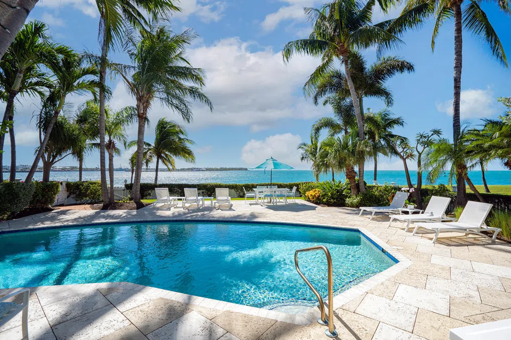 Immerse yourself and come home to prestigious Sunset Key and enjoy all the ambiance and attractions of Key West, just minutes away, while preserving maximum peacefulness and privacy on a beautiful, private island, just offshore from Old Town Key West. Complete with four bedrooms and four bathrooms, this oceanfront residence features a large .19 acre waterfront lot with sixty-three feet of shoreline, expansive ocean and Key West Harbor views, heated pool, spacious, vaulted living area, upper-level master suite plus one additional upper-level en suite bedroom, two main-level bedrooms and baths, natural stone flooring inside and out, golf cart parking and separate garage, electric roll-down hurricane shutters surrounding patios and a rich, warm island decor throughout. Sunset Key is an idyllic island oasis featuring a gourmet restaurant, spa, fitness center, private homeowner beaches, tennis courts, ferry service, and a location nestled in a perfectly secluded spot in Key West harbor.